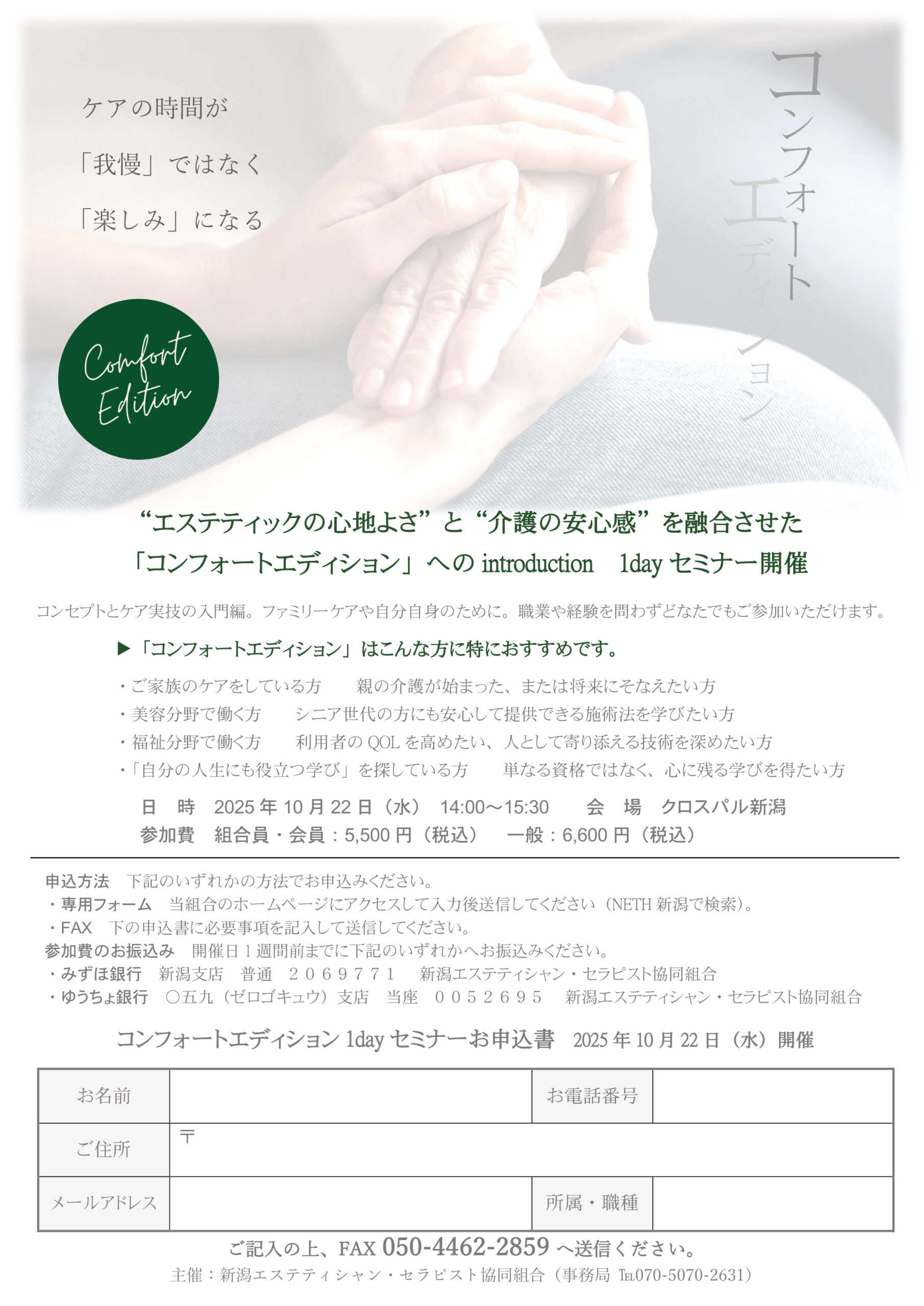 10月開催セミナー ”エステティックの心地よさ”と”介護の安心感”を融合させた「コンフォートエディション」へのintroduction 1dayセミナー